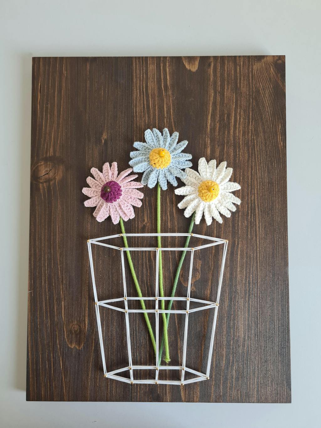 - Ein fertiges Fadenbild auf einem lasierten Holzbrett