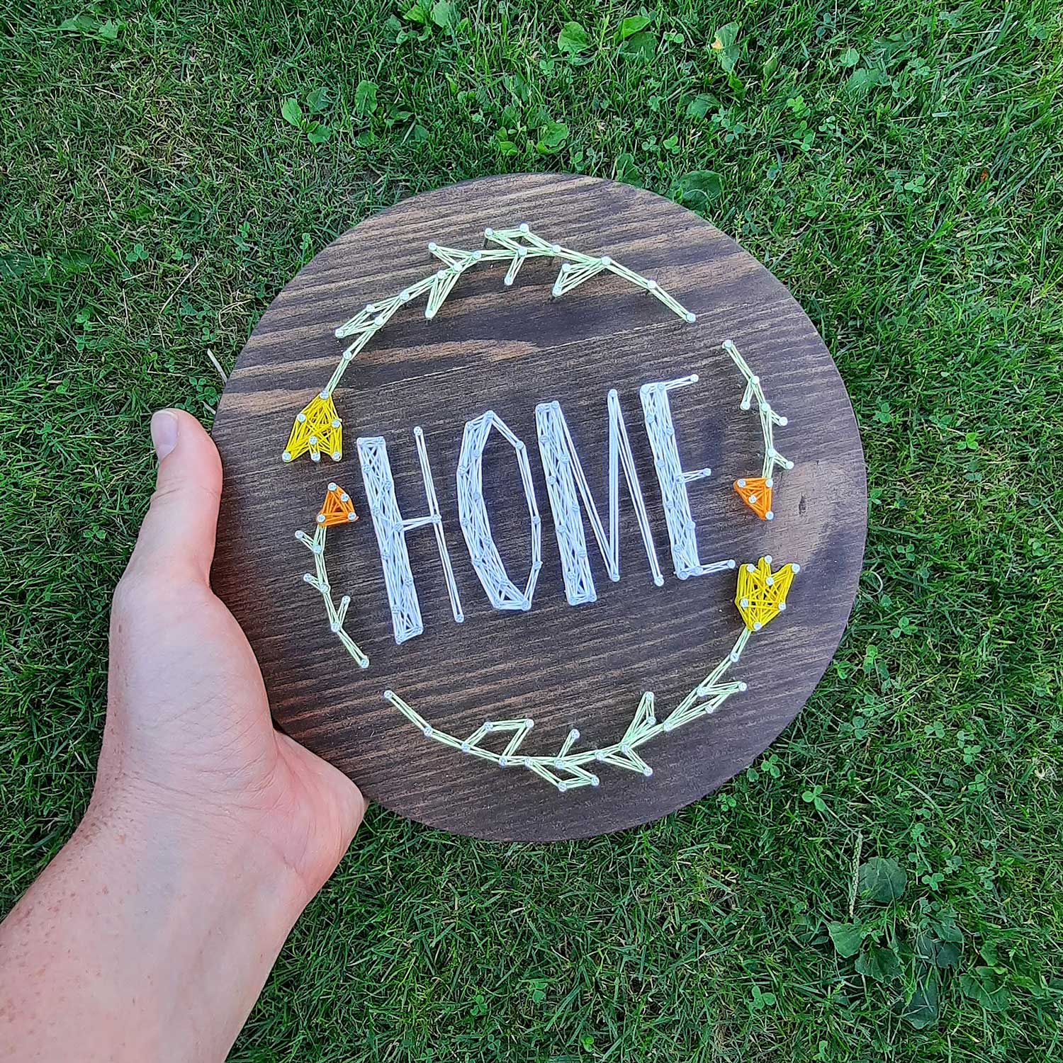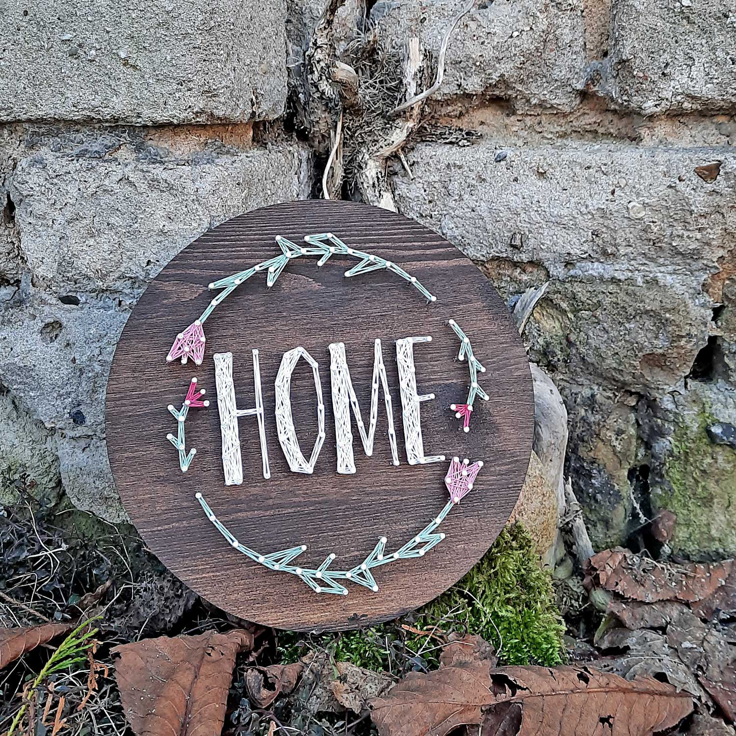 Mit unserem DIY-Set erschaffst du ein liebevolles Fadenbild, das das Wort "Home" mit zarten Blumenranken verbindet. Ein persönliches Statement für dein Zuhause oder ein herzliches Geschenk zur Einweihung, zum Geburtstag oder einfach so.