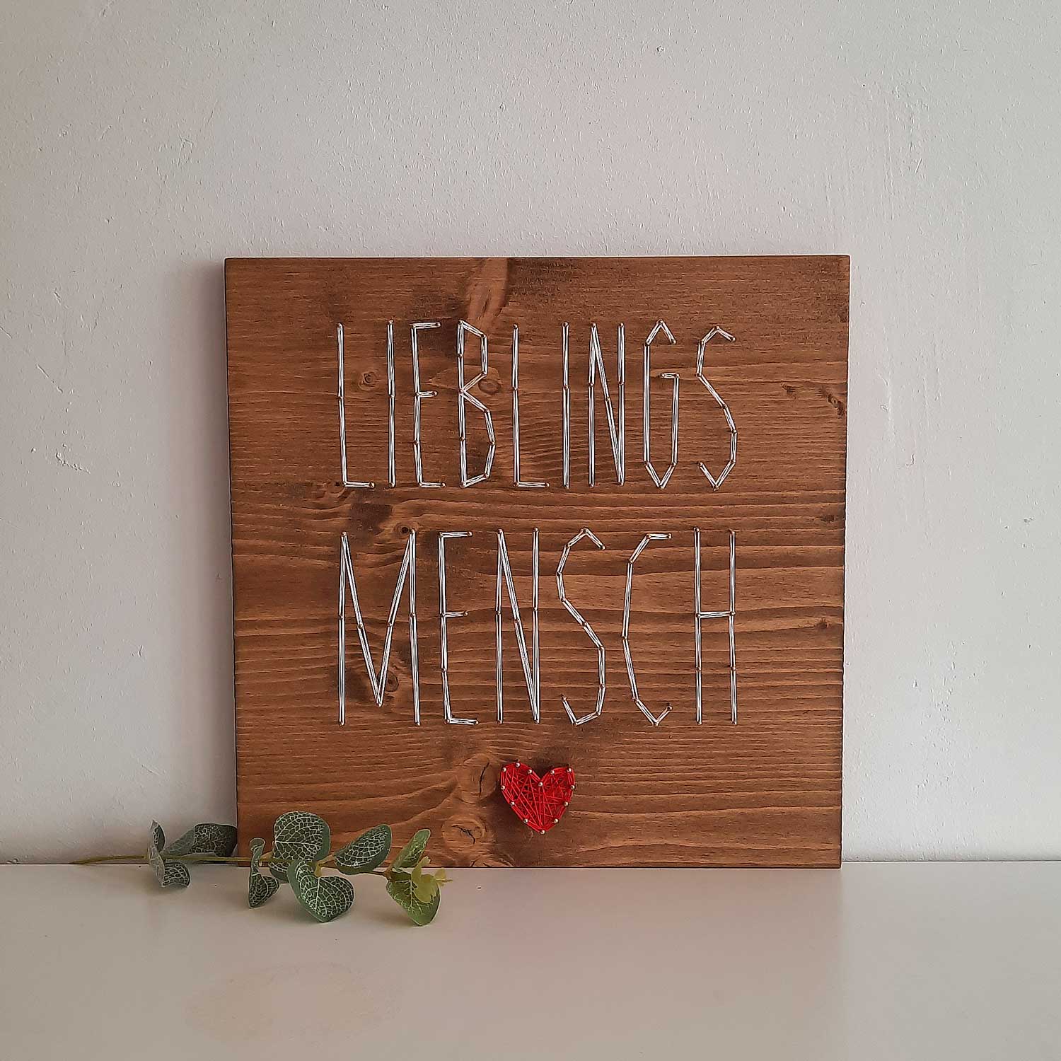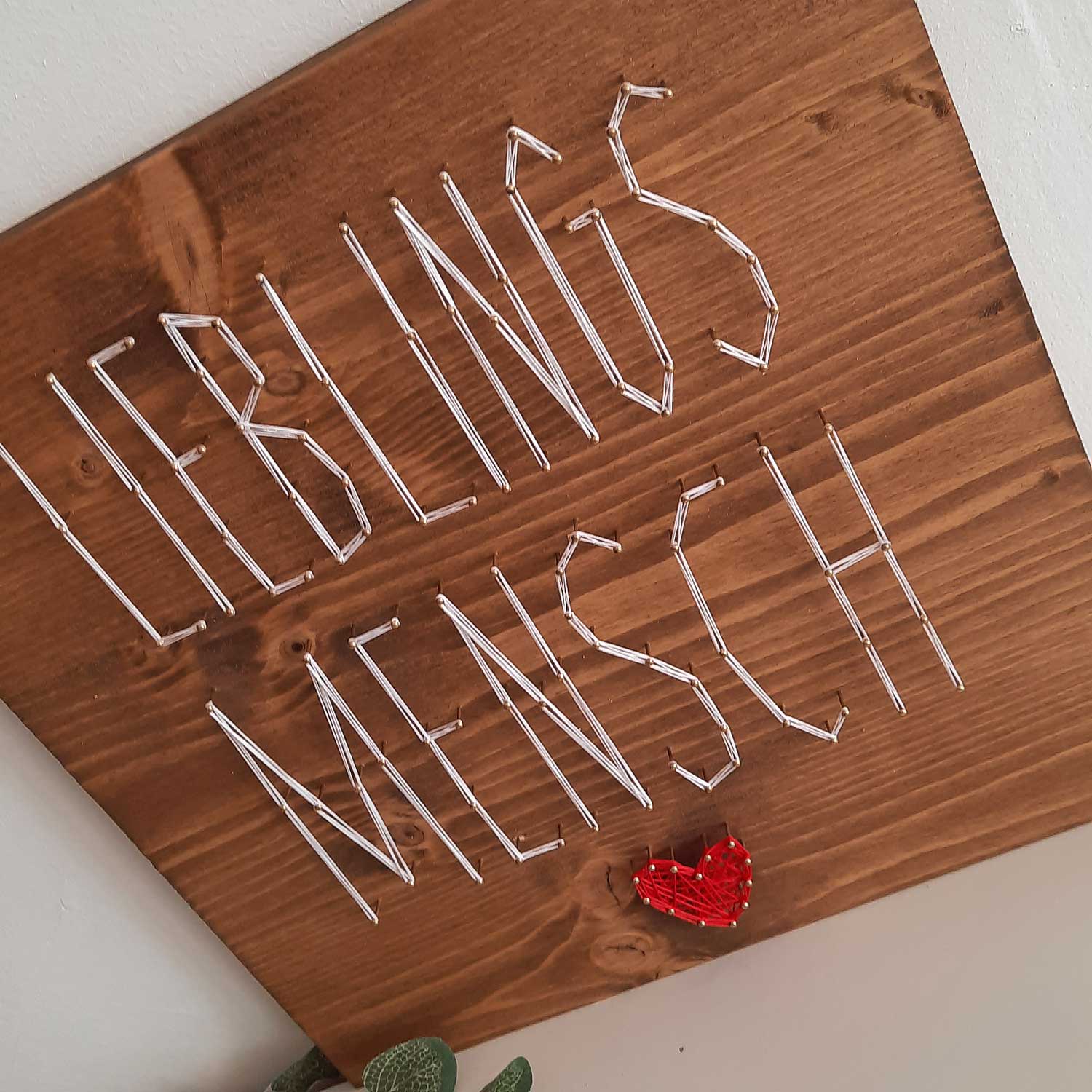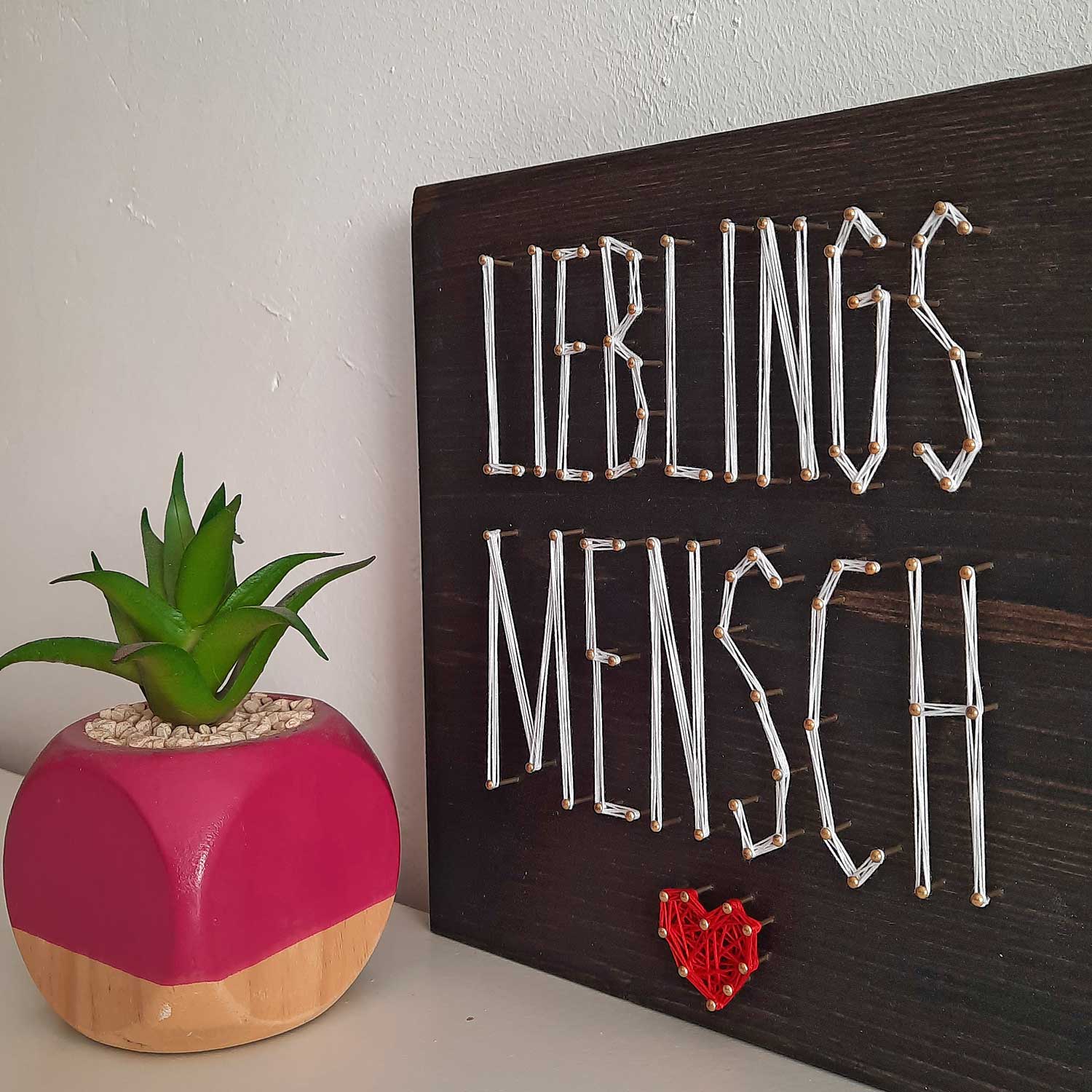 Keine Liebe gleicht der anderen. Das gilt auch für die handgemachte String Art von Fadenbild. Jedes Einzelne ein ganz persönliches Unikat. Egal, ob du es mit unserem Do-It-Yourself-Set selbst anfertigst oder schon fix und fertig bei uns bestellst. Wähle die Größe und die Fadenfarbe ganz nach deinem Geschmack und freue dich auf deine individuelle String Art mit tierisch viel Spaß. Zum selbst Aufhängen oder als wunderbar persönliches Geschenk. Mit unserem Fadenbild „Lieblingsmensch“ sind freudige große Augen garantiert.