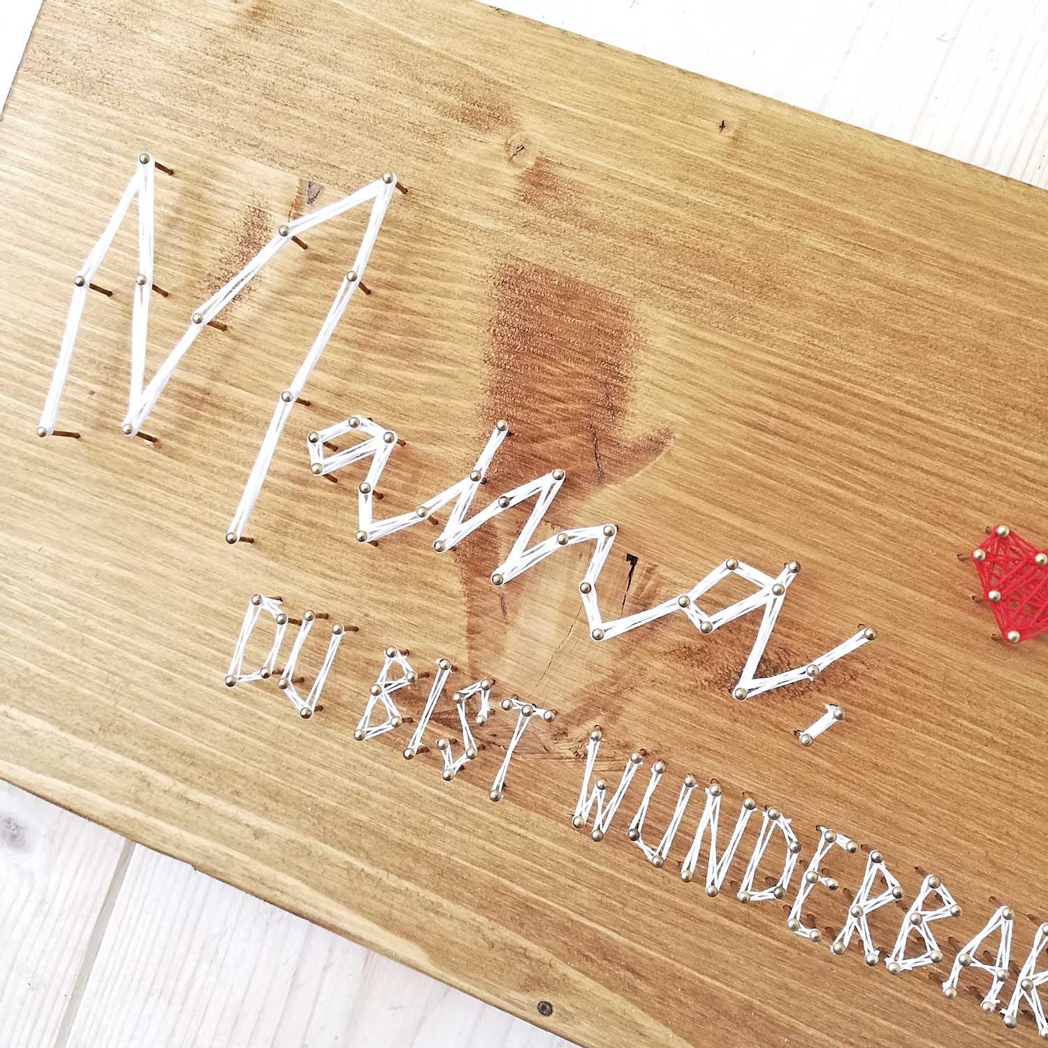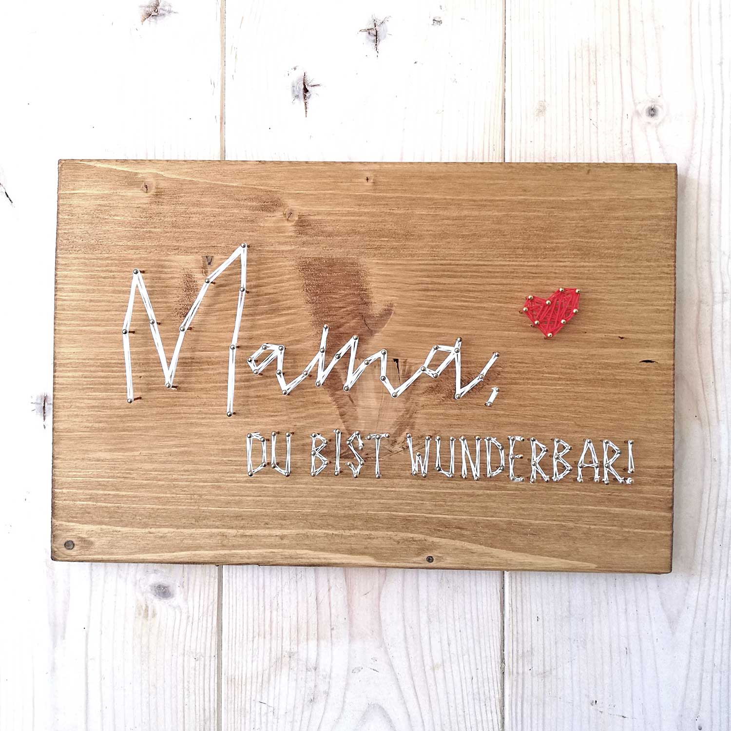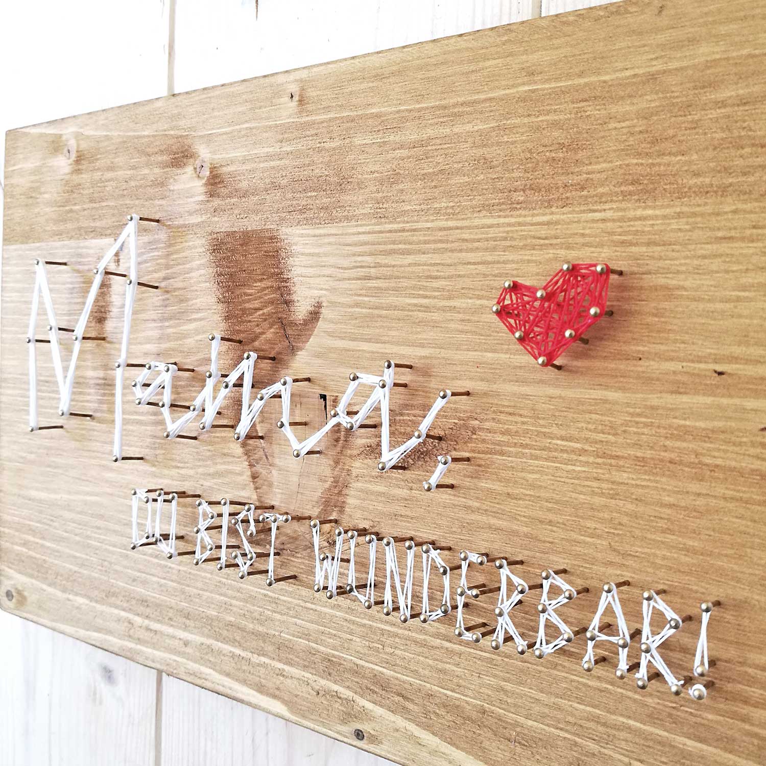Mit unserem DIY-Set kannst du ein einzigartiges Fadenbild mit dem liebevollen Schriftzug "Mama du bist wunderbar" gestalten. Ein persönliches Geschenk, das deine Wertschätzung auf kreative Weise ausdrückt.