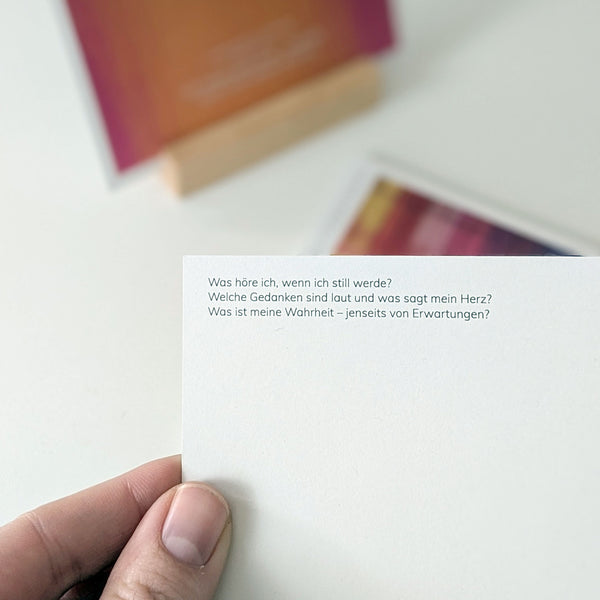 Jede Karte ist beidseitig bedruckt: Vorn findest du das Fadenkunst-Motiv mit Affirmation, auf der Rückseite die Reflexionsfragen. Raum für Notizen inklusive.