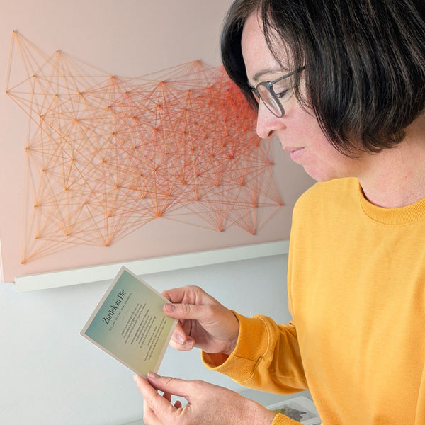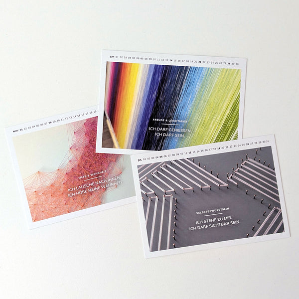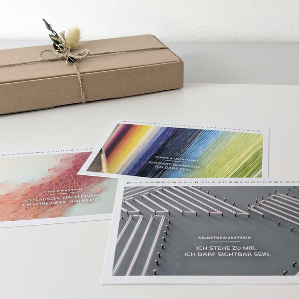 - Jeden Monat schenkt dir eine Karte mit Fadenkunst-Motiv und Affirmation einen kleinen Moment der Stille.
