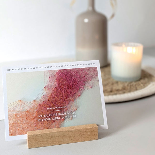 Zwölf Fadenkunst-Motive begleiten dich durch 2026. Jeden Monat eine Affirmation, die dich stärkt und drei Fragen, die dich tiefer mit dir selbst verbinden. Stell die jeweilige Karte in den Holzhalter. Auf deinem Schreibtisch, Nachttisch oder an einem Ort, an dem du sie jeden Tag siehst.