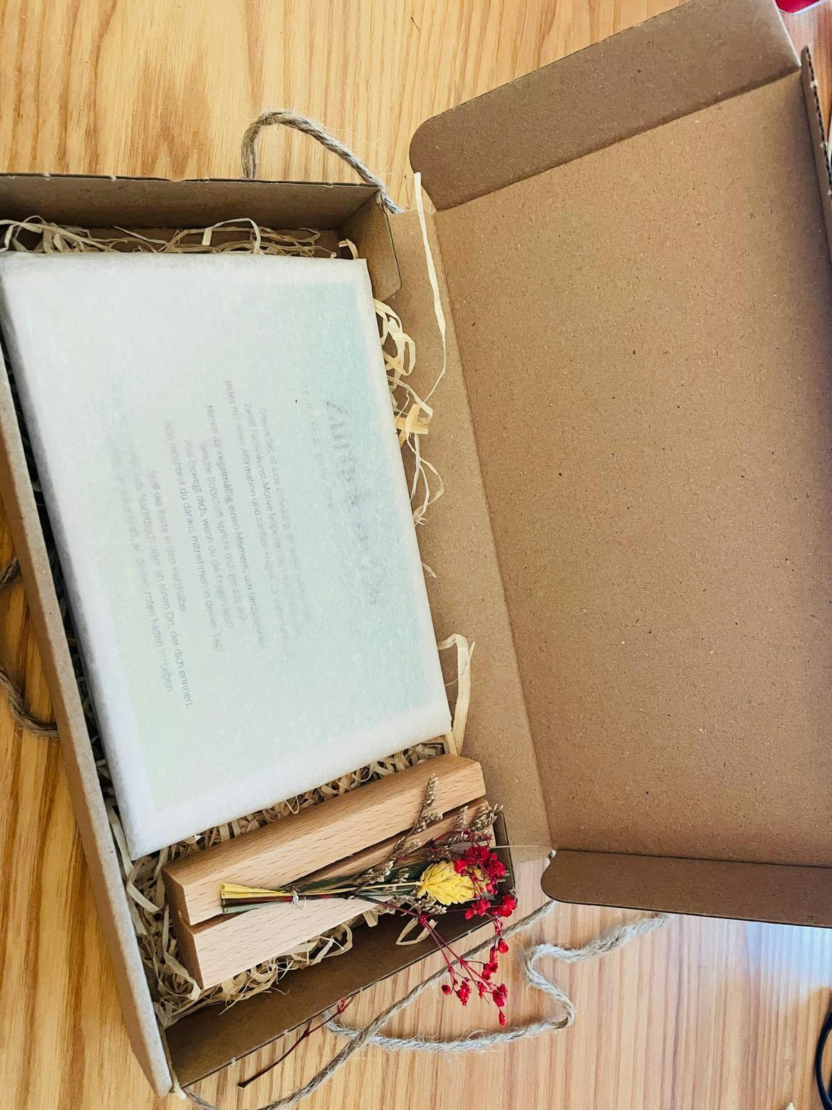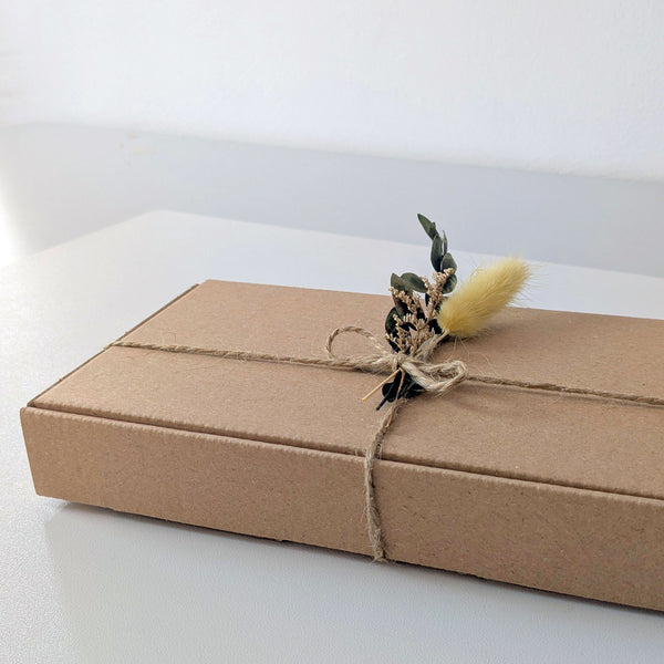 - Verpackung: Seidenpapier, Naturschnur & Trockenblume